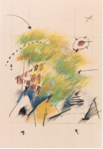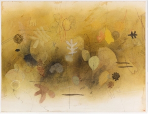 Indian Landscape by Fritz Scholder (1937-2005, Luiseño) and Witch Seed I, #1147 by Emmi Whitehorse (Diné), both part of the Wheelwright Museum’s permanent collection, show the dynamic range of contemporary 2-D art in the collection. Beginning in the 1970s, the Wheelwright Museum shifted focus towards contemporary Native art, reflected by the acquisition and display of works on paper. The World in Chaos, made by Michael Kabotie (1942–2009, Hopi) in 1964, was the first work in the permanent collection to be consciously recorded as contemporary Native art. Since then, the Wheelwright Museum has aimed to advocate for and support the work of emerging and established Native artists, building a reputation for well researched solo shows and thematic exhibitions. The museum’s vision statement of honoring Native voices through art is embodied by the diverse exhibition programming over the last century.