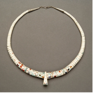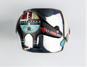 The impressive size and scope of the Wheelwright Museum’s permanent collection allows artistic movements, historical moments, and individual artists’ voices to be mapped over time. One of the strengths of the Wheelwright Museum’s collection is that many of the earliest jewelry works are documented or attributed to known makers, such as the shell and stone necklace worn by Hastiin Klah, and the silver squash blossom necklace made formerly owned by Navajo Tribal Chairman Chee Dodge, and made by the master silversmith Slender Maker of Silver (Béésh-łigaii il’ini Alt’so’sigi, d. 1916). Collections strengths include ‘thunderbird’ or ‘depression era’ jewelry from Kewa (Santo Domingo) Pueblo; an important collection of Zuni fetish carving by pioneers of the artform; the Carl Lewis Druckman collection of Navajo and Pueblo Spoons and a collection of New Mexican filigree work donated by George T. Anderman and Bob Gallegos. Substantial collections exist of work by artists such as Charles Loloma (1921-1991, Hopi) and Preston Monongye (1927-1987, Mission Hopi), both known for their imaginative style and modern designs which challenged conventional perceptions of “Indian art” and “Indian jewelry”. There is a strong representation of works by mid-twentieth century artists such as Kenneth Begay (1912-1977, Navajo), Lewis Lomay (1913-1996, Hopi), Joe Quintana (1915-1991, Cochiti Pueblo), and Morris Robinson (1900-1987, Hopi) with more potential for growth as regards Hopi jewelers such as Victor Coochwytewa (1922-2011). This draws attention to the ways in which these artists responded to this key moment in design history, one characterized by the prevalence of modernism and the post-war craft resurgence. It allows researchers to trace the careers of important figures showing the significant influence they had on one another, and highlights the skills, techniques, aesthetic tastes, and creativity of different generations of artists.
