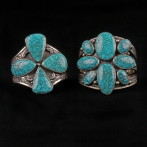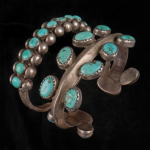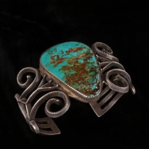 Jewelry making in the Southwest is major artform, and in the public imagination encoded in the combination of silver and turquoise. As an artistic domain it is highly dynamic and constantly influenced by, and responsive to, the economic and cultural history of the region, including government policy, collecting markets, the curio trade, and the availability of raw materials like turquoise and silver. Diné silversmithing first emerged in the 1850s dating from after the internment of Diné people at Bosque Redondo in southern New Mexico, influenced by local blacksmithing. Early silversmithing build upon pre-existing indigenous jewelry traditions, notably those of Pueblo and Diné communities who have long produced, worn and traded jewelry made with coral, shell, and stone. Charting the early history of silverwork, we see the emergence of the iconic styles of the Southwest from the 1870s – the squash blossom necklaces and concho belts – reflecting the importance of settlers, artists and tourists coming with the railroad as consumers and patrons of the artform. Works made from both precious and non-precious materials reflect changes in the availability of different materials throughout the nineteenth and twentieth centuries. Aesthetic and design sensibilities are never fixed, with distinct Pueblo and Diné visual traditions emerging and influencing one another in parallel and intersecting creative moments. Intergenerational knowledge of materials and techniques is maintained in families and communities, forming links between artists whose work is featured in the Wheelwright Museum’s collection.