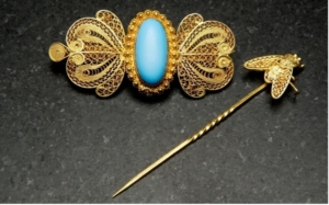 New Mexican gold filigree tie pin and pin with turquoise, ca. early twentieth century